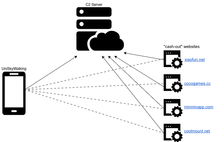 These cashout websites use the same unique identifiers seen in the SkyWalk framework and the C2 server to link website impressions to the apps running the sites in the background.