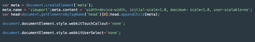 The first JS code sets the viewport to the device's dimensions, sets the zoom to 100% and disables zoom to handle the pinch gesture. The second JS code disables the long-press gesture on WKWebview, which usually causes a context menu to pop. The third JS code handles the long-press + drag gesture normally used to select text inside a browser environment on mobile devices.
