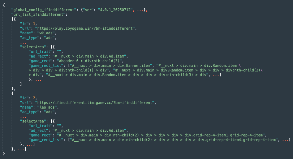 Although this looks complex, it is quite straightforward. The C2 server provides a list of URLs that the app com.minigame.SpotTheDifference (referenced as “ifinddifferent” in the fraud operation) can iterate to generate false ad impressions. It also provides the query selector used to initiate vignette impressions.