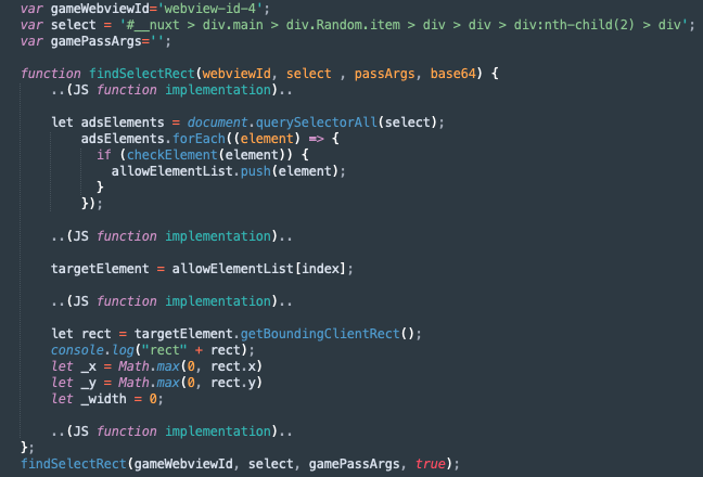 After decoding this information, we found it to be the same JS code the SkyWalk framework uses to get the X,Y coordinates (findSelectRect function) noted during our dynamic analysis of the applications — without the needed parameters the SkyWalk framework provides during runtime.