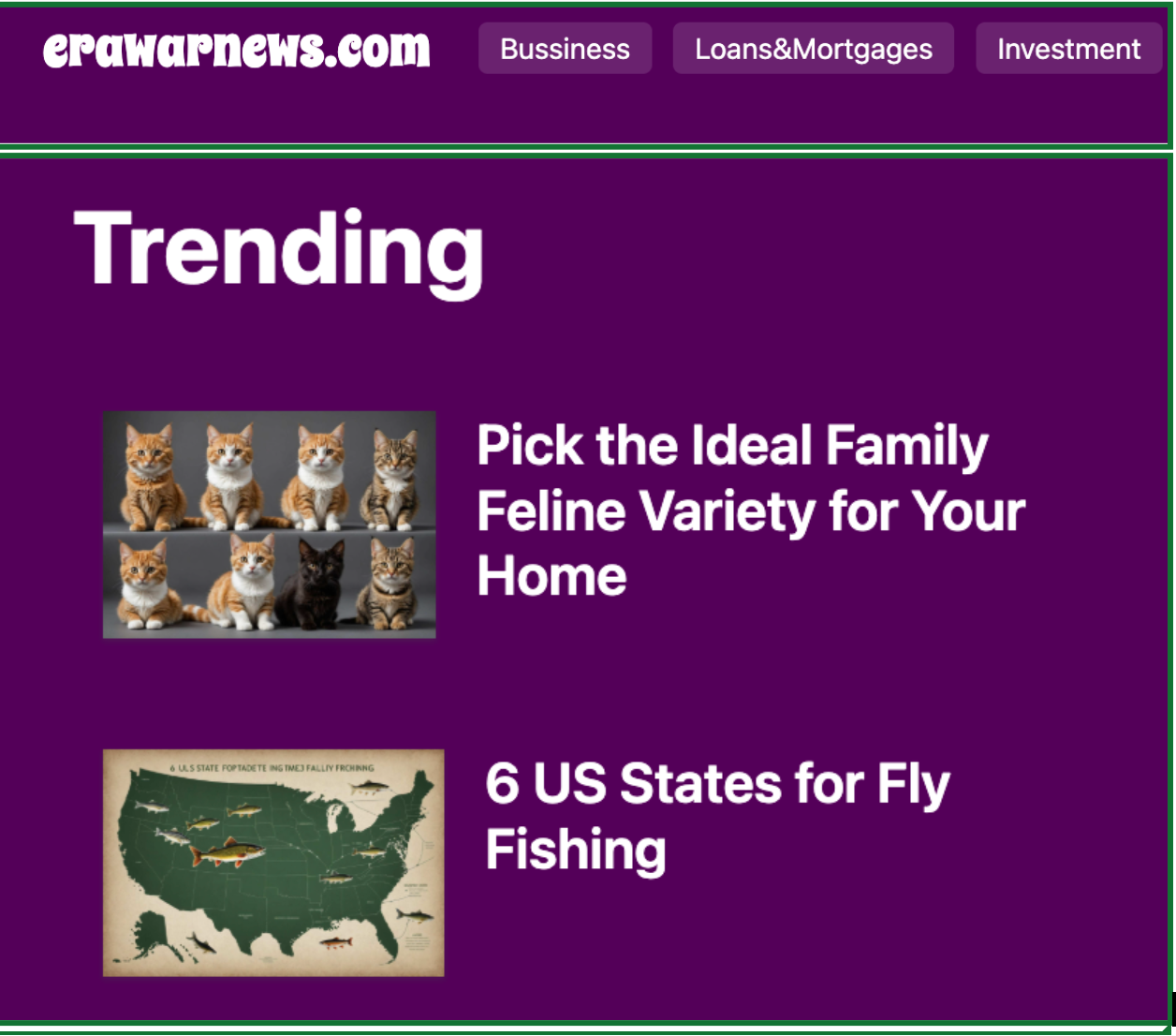 The SkyWalk investigation revealed the common overlap between impression fraud, click fraud and GenAI-powered slop sites. AI slop sites were frequently the cashout vehicle in this scheme. One example, below, is presented as a news website with “Bussiness” [sic] and “Investment” sections. In fact, it is largely a warehouse of generic AI slop content shared with additional sites tied to the SkyWalk scheme: