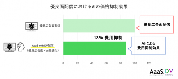 - 「AaaS with DV」による配信では、AIによる配信ペースやタイミングの最適化を行うことで、優良広告面配信に伴う費用上昇を通常配信に対して平均1.03倍に抑え、ほぼ同等コストで配信を実現します。さらに、AIでの最適化を実施していない優良広告面配信との比較では、約13%のコスト削減を実現しました。